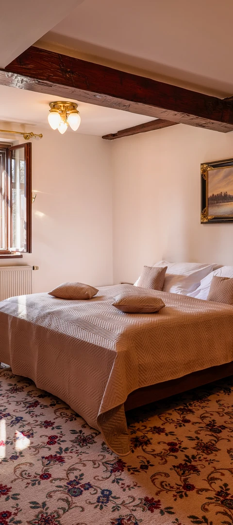 Stylový pokoj s kvalitním vybavením. Pokoje s manželskou postelí či oddělenými lůžky, koupelna s vanou. Wifi připojení a televize na pokoji. Bohatá snídaně v ceně ubytování.
