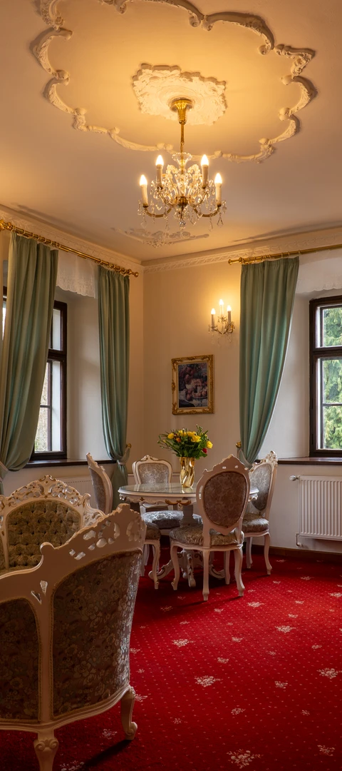 Mimořádný pokoj, který na Vás při vstupu zaručeně udělá dojem. Unikátní nábytek v barokním stylu Ludvíka XIV. Velká rohová vana pro odpočinek po procházce městem. Obývací pokoj s velkým stolem, lze využít i na soukromá jednání a schůzky. Novomanželské apartmá během konaní svatebních hostin v hotelu.
